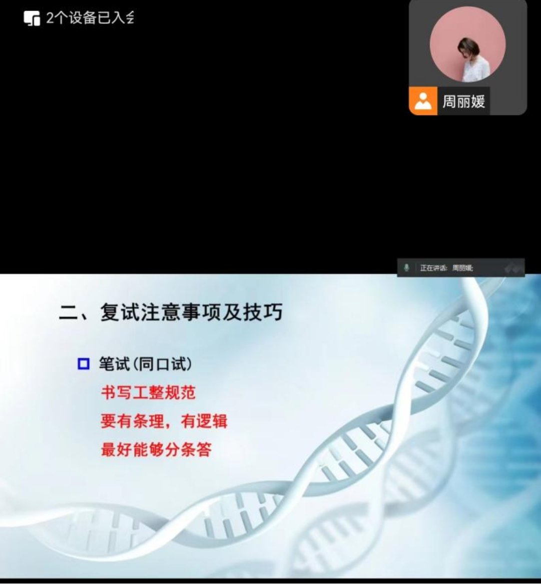 张老师围绕眼下该做什么、有哪些复试注意事项与技巧、如何选择导师三个方面详细讲解。一是要求学生们泛化地了解学校和专业相关信息,如报考学校和专业的发展沿革、突出业绩,报考专业的导师研究领域和成果,专业相关的书籍、实验记录、实验原理、相关文献,以及专业相关的国际国内时事新闻。二是以结果为导向精准深挖复试技巧,如沿着“导师喜欢什么样的学生”这一思路,挖掘自身潜力,体现专业能力、综合能力和科研潜力;提前进行线上线下面试的设备、着装、谈吐等的准备;提前实操模拟复试场景,预设专业相关提问等。三是鼓励同学们多方了解选择导师,同时对导师的研究方向做一定了解。最后,张老师围绕学生们常见的备考问题逐一解答,并对自荐信、简历、邮件的撰写给予针对性指导。