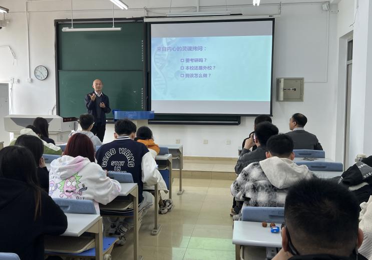 张成林教授以“适合读研吗?”“真心考研吗?”“能够坚持下去吗?”三个问题开始讲座。首先介绍了研究生的日常学习内容和科研任务,让大家对研究生有更加清楚的认识。随后分析了近几年考研形势和相关数据,让大家对于考研院校选择、考研难度等有了更加清楚的认识。此外,针对不同考研科目,张老师提出不同复习策略,英语复习要细水长流,专业课复习要多多益善,张老师详细讲述了不同科目的不同复习策略,让学生有了明确的复习方法和复习目标。