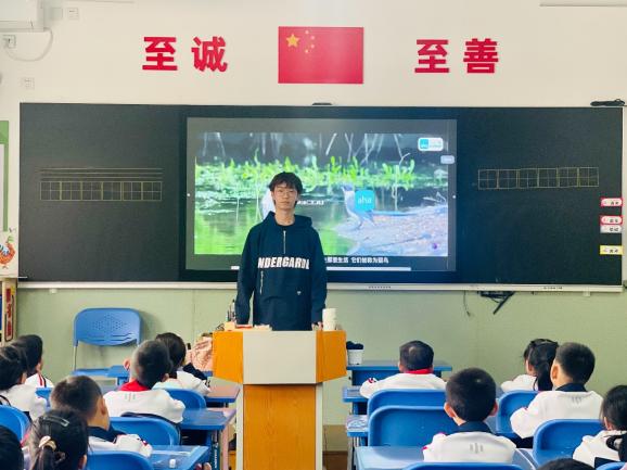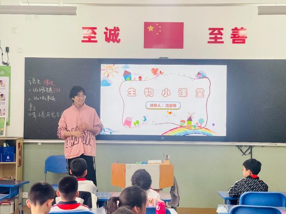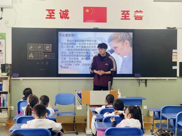 生物工程学院课后服务志愿者2022级本科生王康、沈道明从动画片中的卡通人物形象并不是真正的生物开始介绍地球上的生命,先后介绍了动物、植物、微生物、病毒等,还介绍了“寒武纪生命大爆发”、“侏罗纪是恐龙的鼎盛时期”、和人类进化起源于猿,经历了猿人类、原始人类、智人类、现代人类四个阶段等内容。