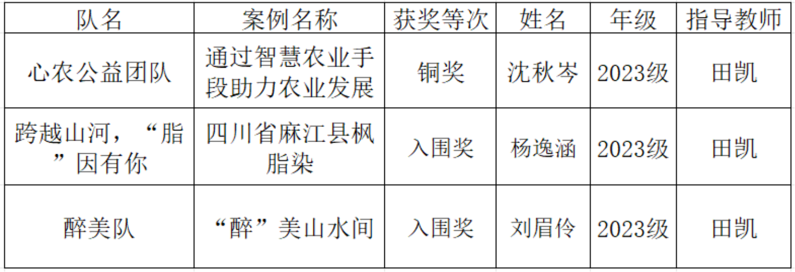 近日,由中国农学会教育专业委员会、全国研究生乡村振兴案例大赛组委会主办的2024年全国研究生乡村振兴大赛评选结果已出。经组委会组织专家组对所有参赛高校的案例文本进行评审,择优选出42个案例晋级决赛,77个案例获得铜奖,99个案例获得入围奖。生物工程学院2023级研究生沈秋岑获得铜奖、2023级研究生杨逸涵和刘眉伶获得入围奖。