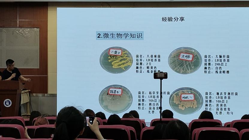组委会介绍了本届微世界艺术大赛的赛事流程,提出将微生物绘画创作与“善作善成绘青春·敢想敢创做先锋”紧密结合的思路。第八届微生物培养皿艺术大赛获奖团队——生物工程学院本科生李小雨和高明英作为负责人分享了参赛经验,从创作灵感、制作材料、制作过程、作品拍摄、文案撰写、内涵挖掘等方面讲解了获奖作品,强调一定的微生物知识储备和基本的微生物实验操作是在微生物培养皿中发挥绘画创意的基本前提,分享了微世界艺术大赛对她们走近科研、乐享科研的重要启蒙作用。