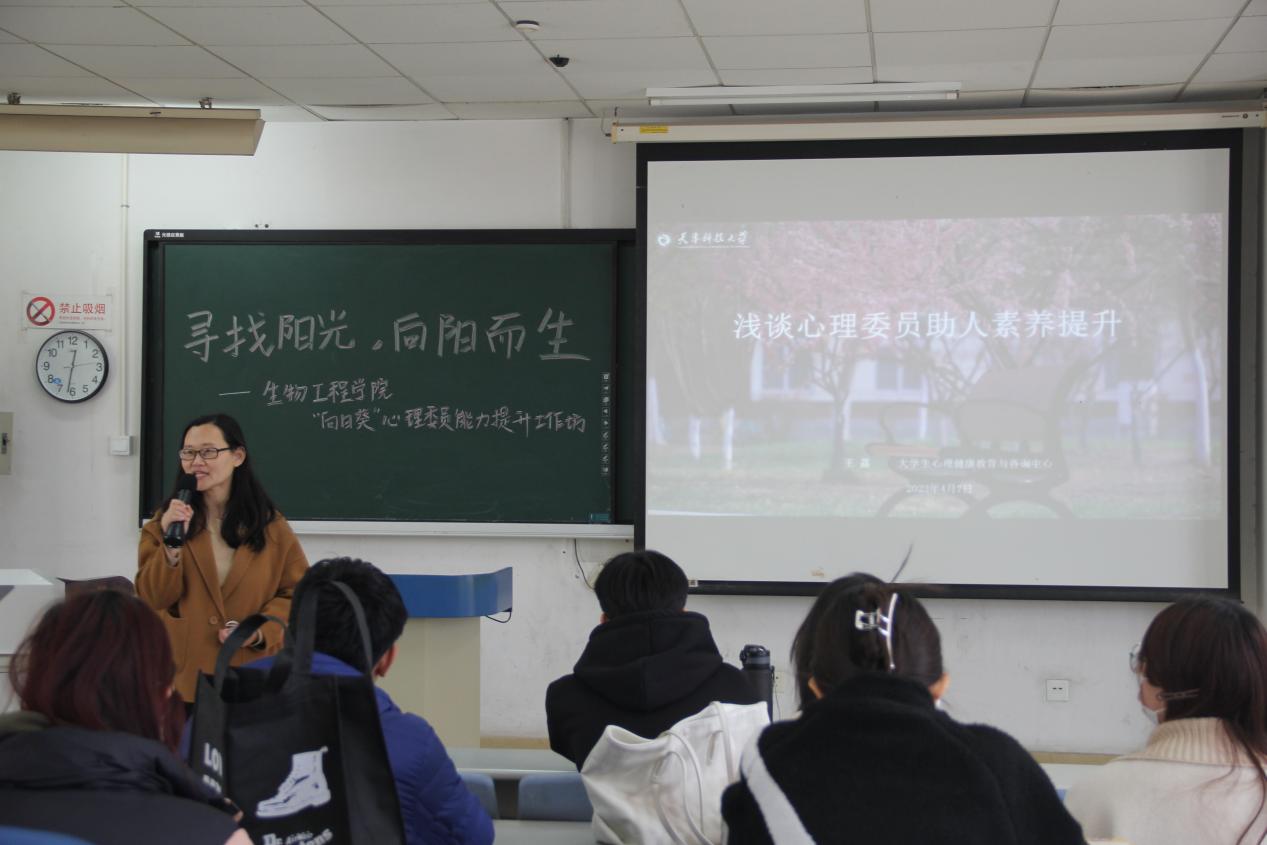“作为班级心理委员,有哪些工作职责?在维护好自身心理健康的基础上,如何更好的帮助身边的同学,成为他们心理健康的守护者?”为充分调动和发挥心理委员在班级心理健康教育工作中的积极性和主动性,更好地为同学们服务,4月7日中午,生物工程学院于滨海中校区3号楼209教室举行了以“浅谈心理委员的助人素养提升”为主题的心理委员能力提升培训讲座,学校大学生心理健康教育与咨询中心王荔老师受邀主讲,生物工程学院全体心理委员参加。讲座由生物工程学院团委书记任艳萍主持。