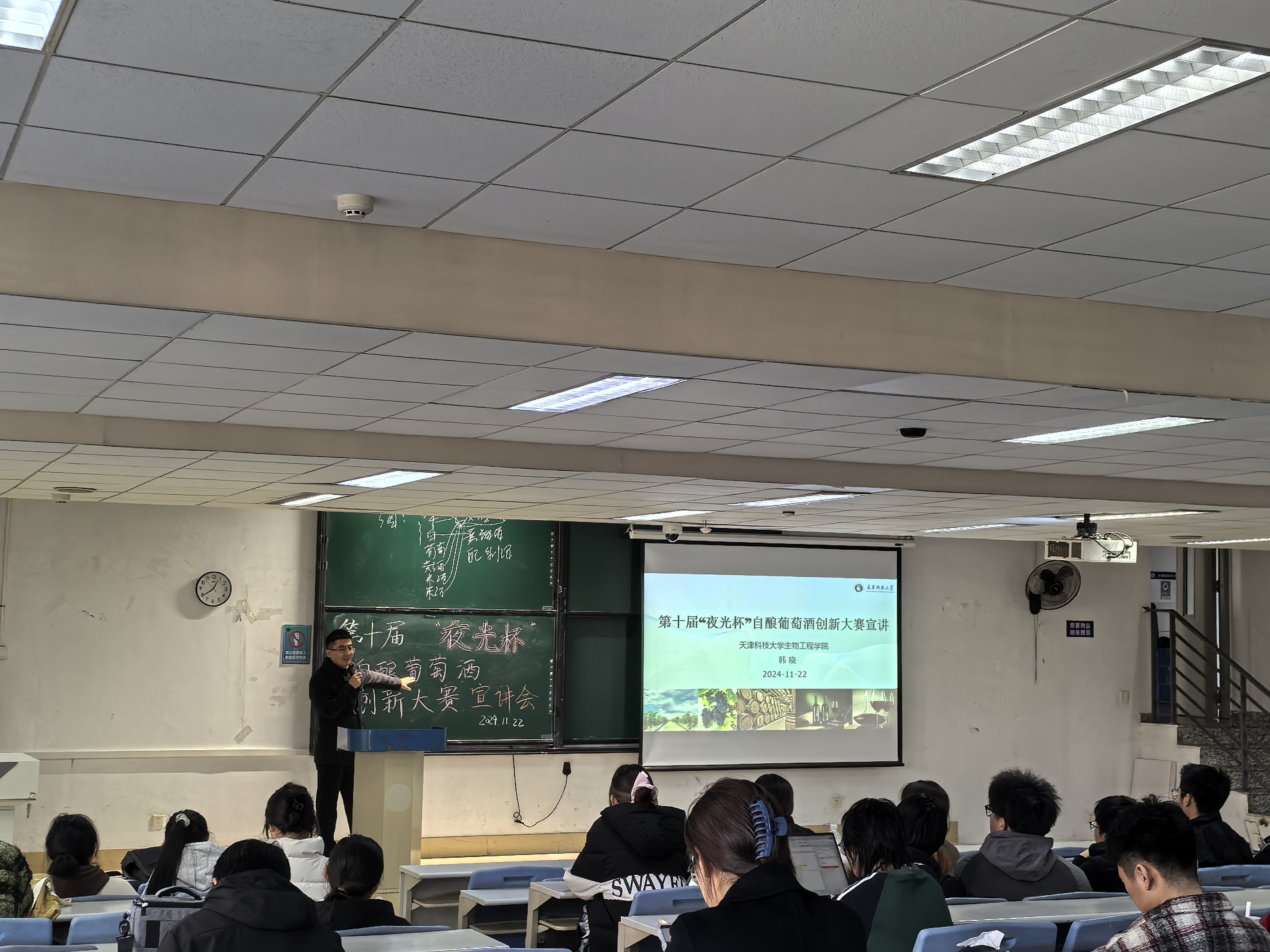 生物工程学院专业教师韩晓为现场同学带来别开生面、充满惊喜的葡萄酒文化与品鉴宣讲。韩老师以深入浅出的方式为同学们深入剖析了葡萄酒的历史文化脉络、复杂精妙的酿造工艺以及极具艺术感的品鉴技巧。更为精彩的是,韩老师现场开启了一瓶葡萄酒,为学生们现场讲解分享。同学们仿若置身于一个充满魅力与奥秘的葡萄酒世界,沉浸其中,不时地提出问题,与老师积极互动,现场气氛热烈似火。